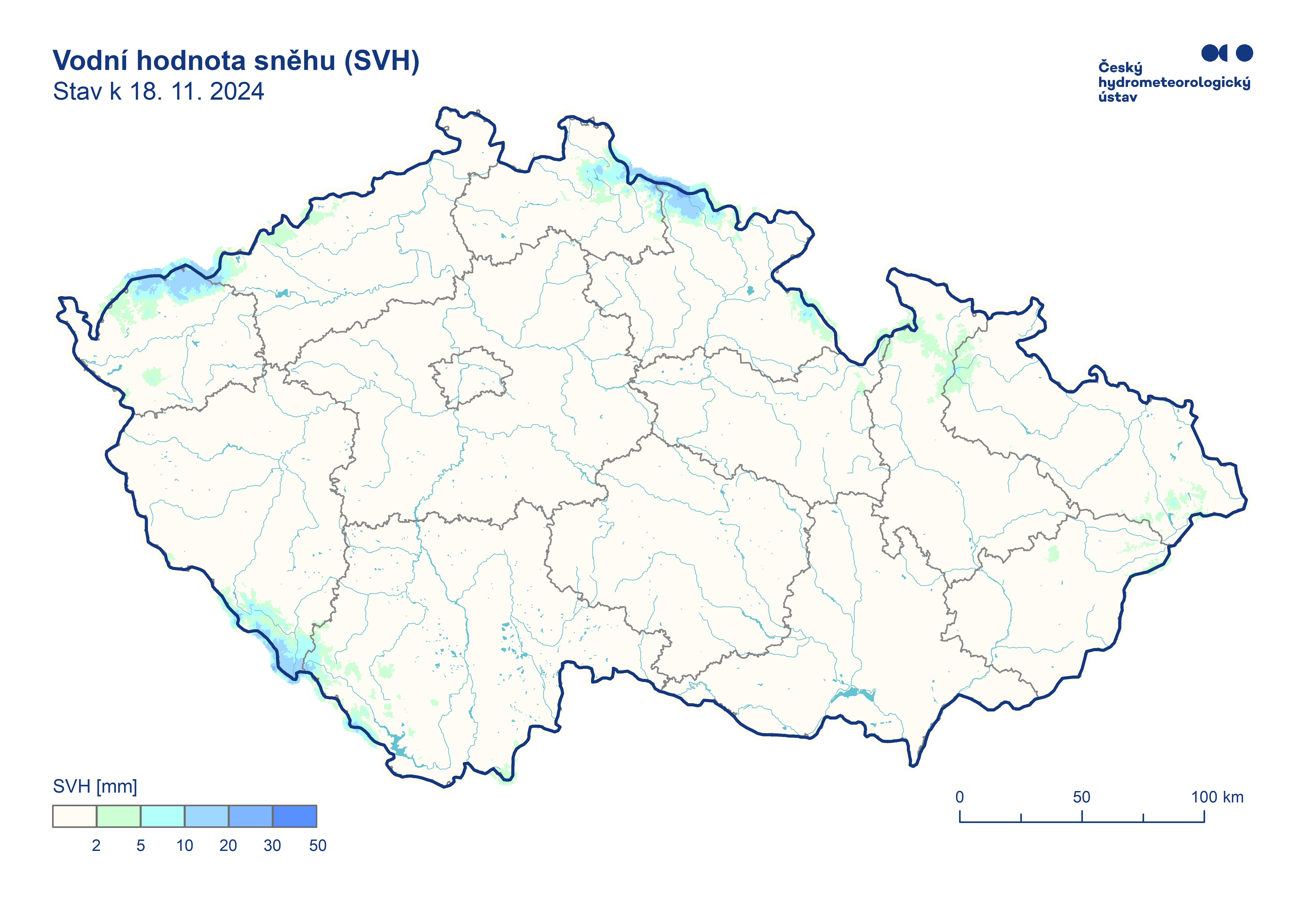 Odhad celkového množství vody ve sněhové pokrývce na území ČR k 18. 11. 2024 činí cca 0,024 mld. m3, což představuje v průměru cca 0,3 mm (0,3 litrů na jeden metr čtvereční).