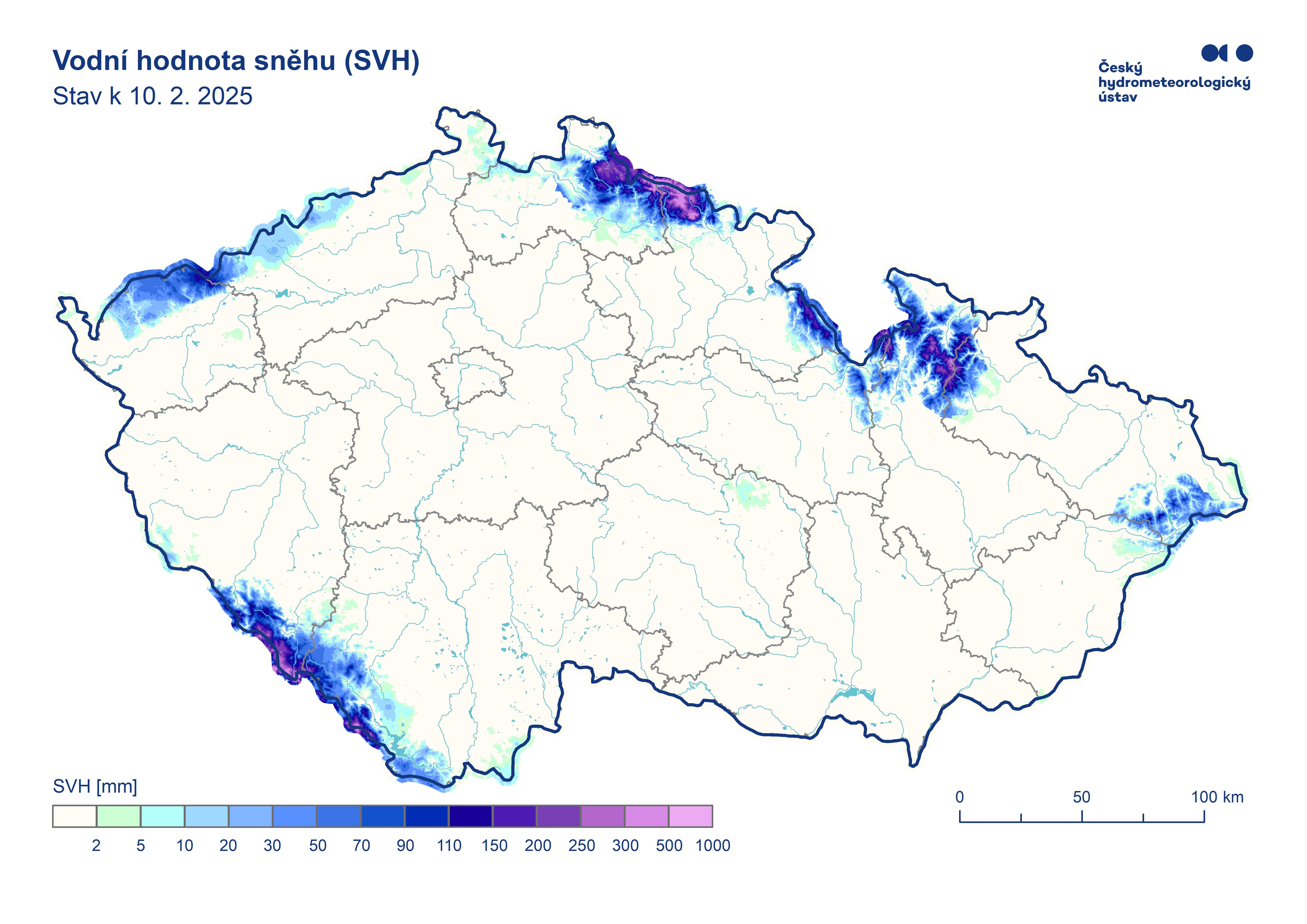 Odhad celkového množství vody ve sněhové pokrývce na území ČR k 10. 2. 2025 činí cca 0,377 mld. m3, což představuje v průměru cca 4,8 mm (4,8 litrů na jeden metr čtvereční). Zásoby vody ve sněhu se pro celkovou plochu ČR ve srovnání s předchozím týdnem slabě snížily. Oproti hodnotám z minulého týdne (30 % průměru pro 5. týden) jsou aktuálně zásoby vody ve sněhu na 25 % dlouhodobého průměru pro šestý týden v roce.