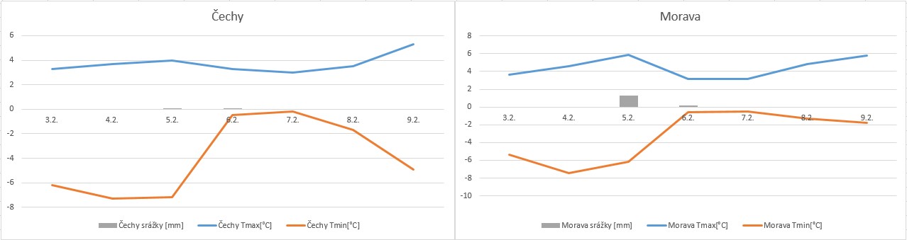 Výhled: V průběhu následujících dní se bude postupně ochlazovat a přidají se občasné srážky, které budou postupně ve všech polohách přecházet ve sněhové. Zásoby vody ve sněhu by se tak měly mírně zvětšit. Nejchladněji bude v závěru týdne, kdy srážek ubyde a můžeme očekávat celodenní mrazy i v nižších polohách.