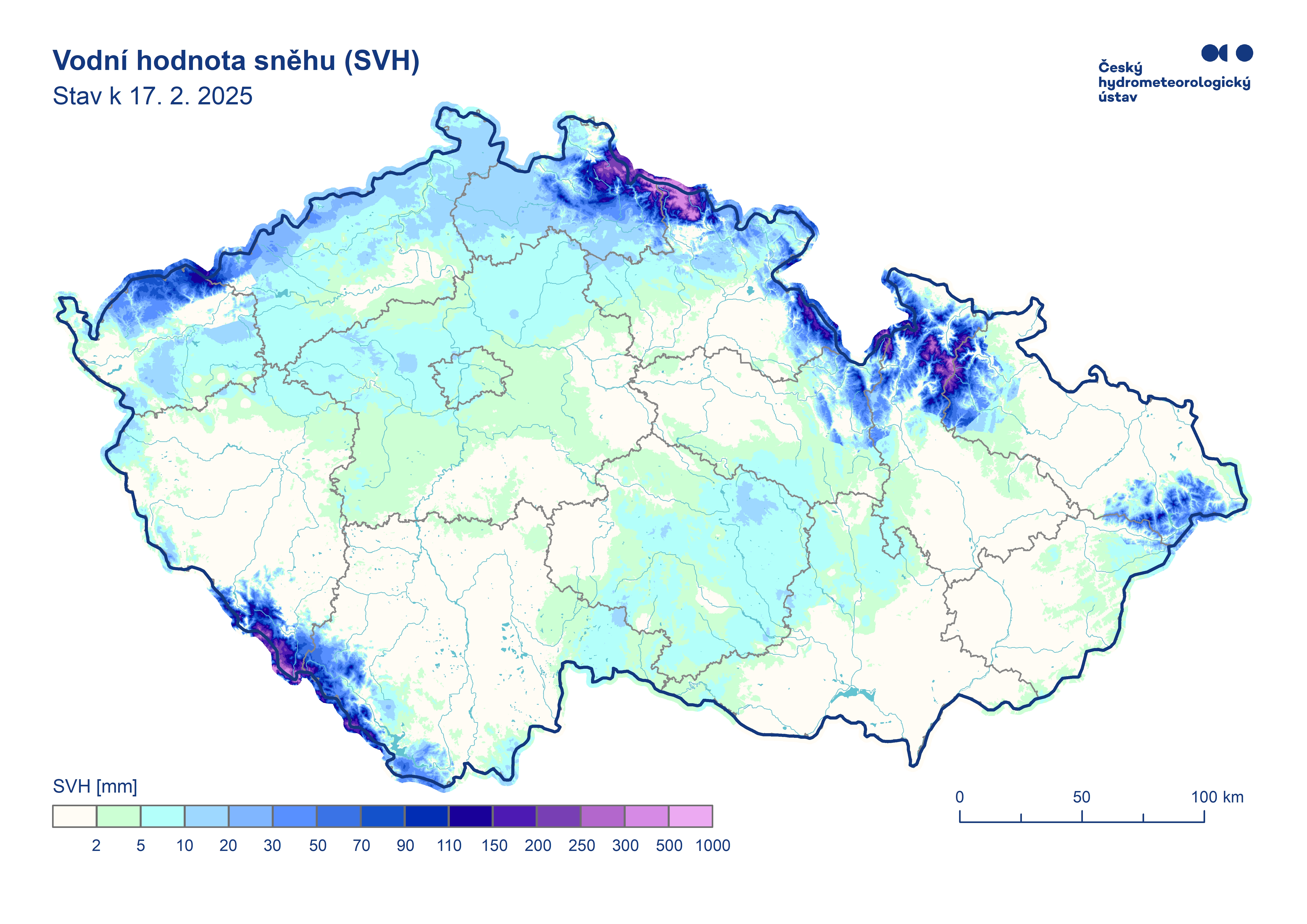 Odhad celkového množství vody ve sněhové pokrývce na území ČR k 17. 2. 2025 činí cca 0,710 mld. m3, což představuje v průměru cca 9 mm (9 litrů na jeden metr čtvereční). Zásoby vody ve sněhu se pro celkovou plochu ČR ve srovnání s předchozím týdnem slabě snížily. Oproti hodnotám z minulého týdne (25 % průměru pro 6. týden) jsou aktuálně zásoby vody ve sněhu na 47 % dlouhodobého průměru pro sedmý týden v roce.