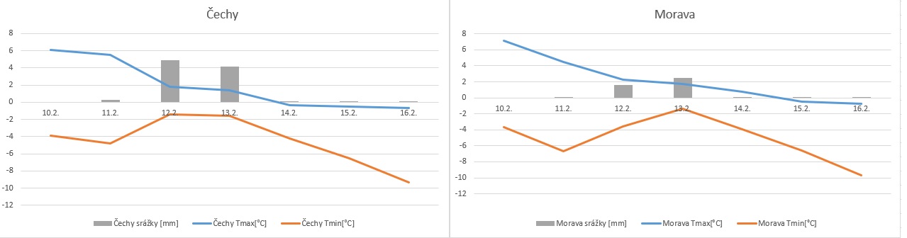 V první polovině týdne bude pokračovat studené počasí a především noční teploty budou velmi nízké. Ve druhé polovině týdne se bude postupně oteplovat, nejvíce na horách, naopak v nížinách může místy díky inverzi vydržet chladnější počasí. Srážky až do konce týdne téměř neočekáváme, největší pravděpodobnost alespoň slabých srážek je zatím v pátek.