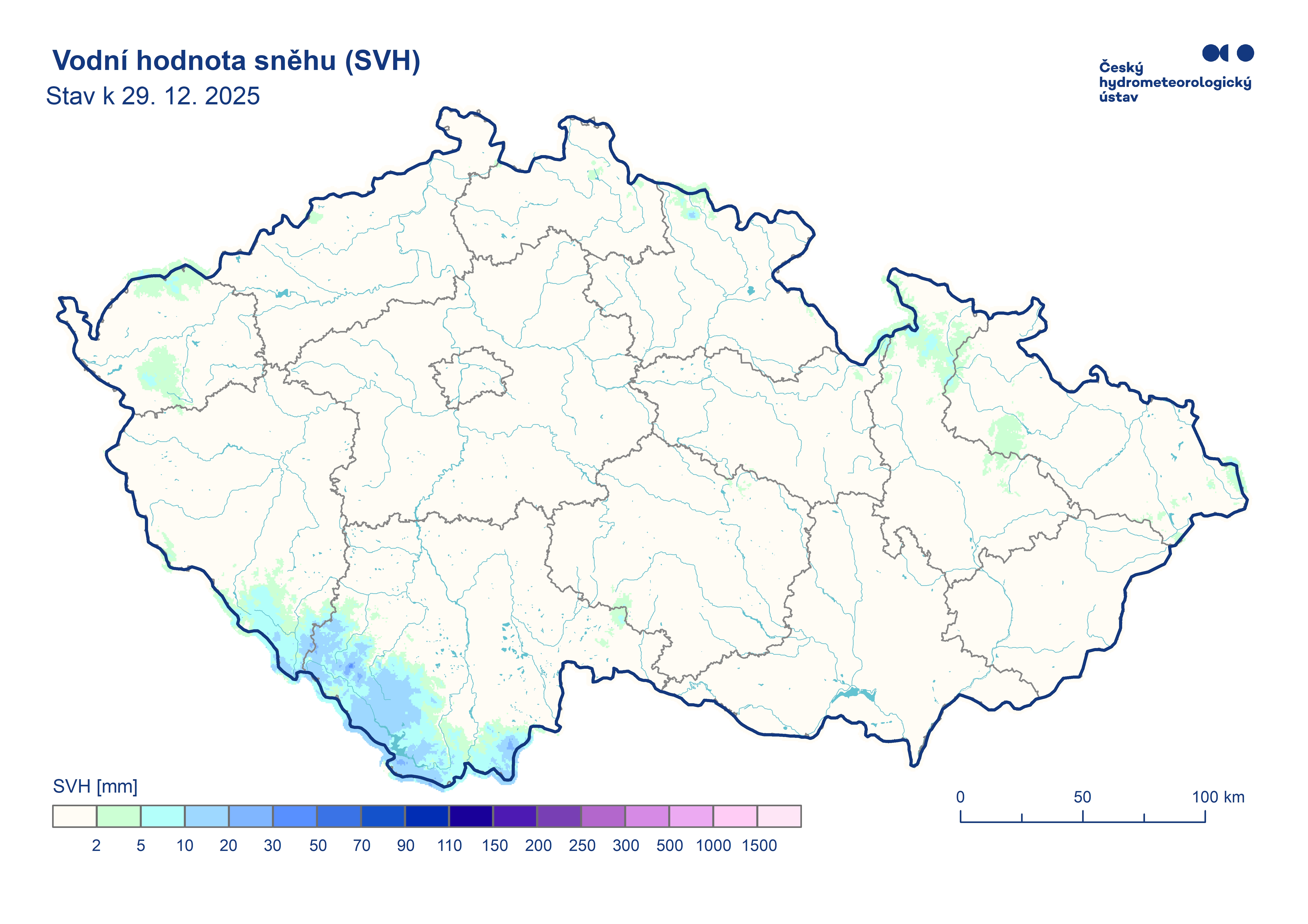 Odhad celkového množství vody ve sněhové pokrývce na území ČR k 29. 12. 2025 činí cca 0,047 mld. m3, což představuje v průměru cca 0,6 mm (0,6 litrů na jeden metr čtvereční).