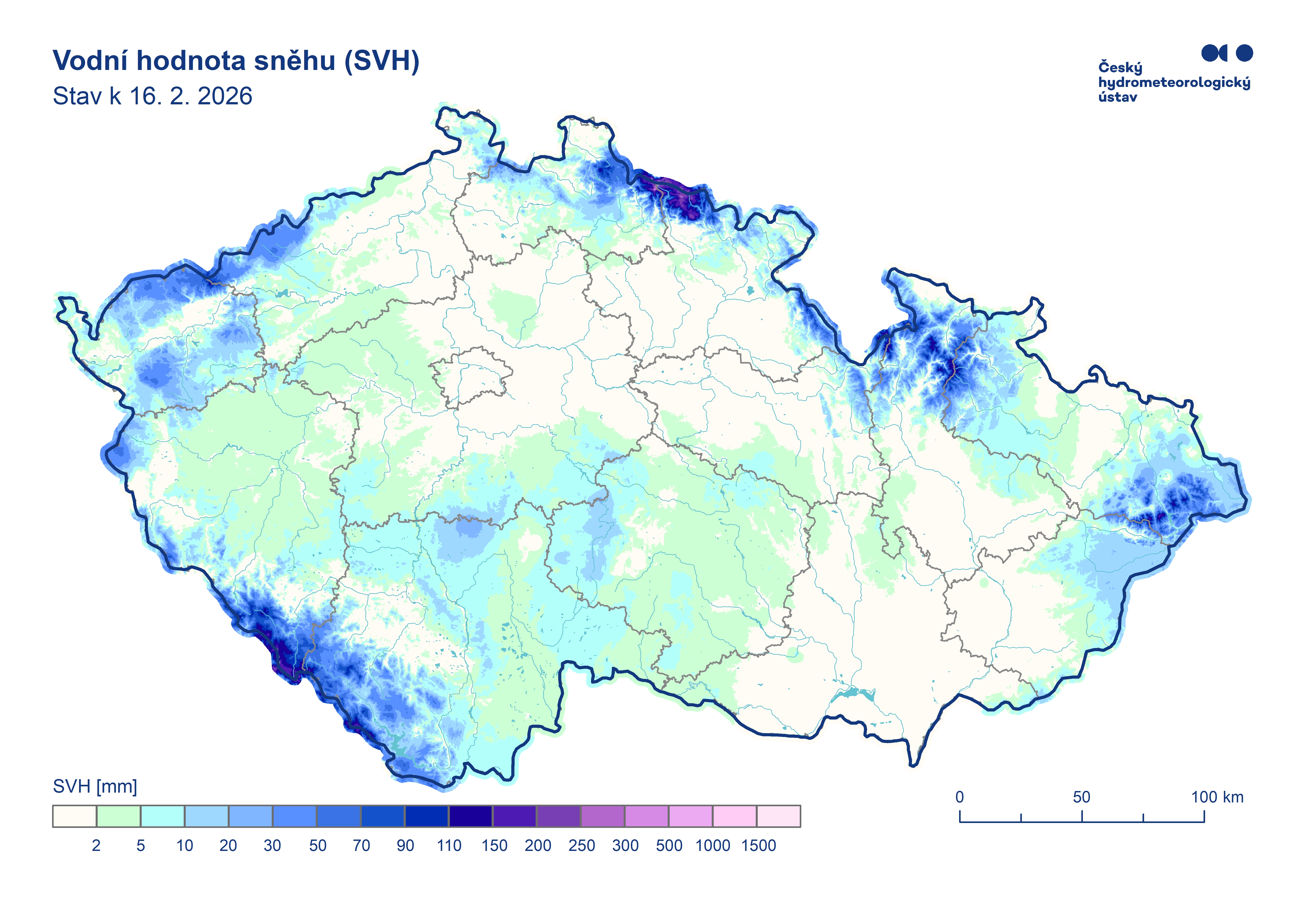 Mapa rozložení vodní hodnoty sněhu (SVH) v ČR ke dni 16.02.2026