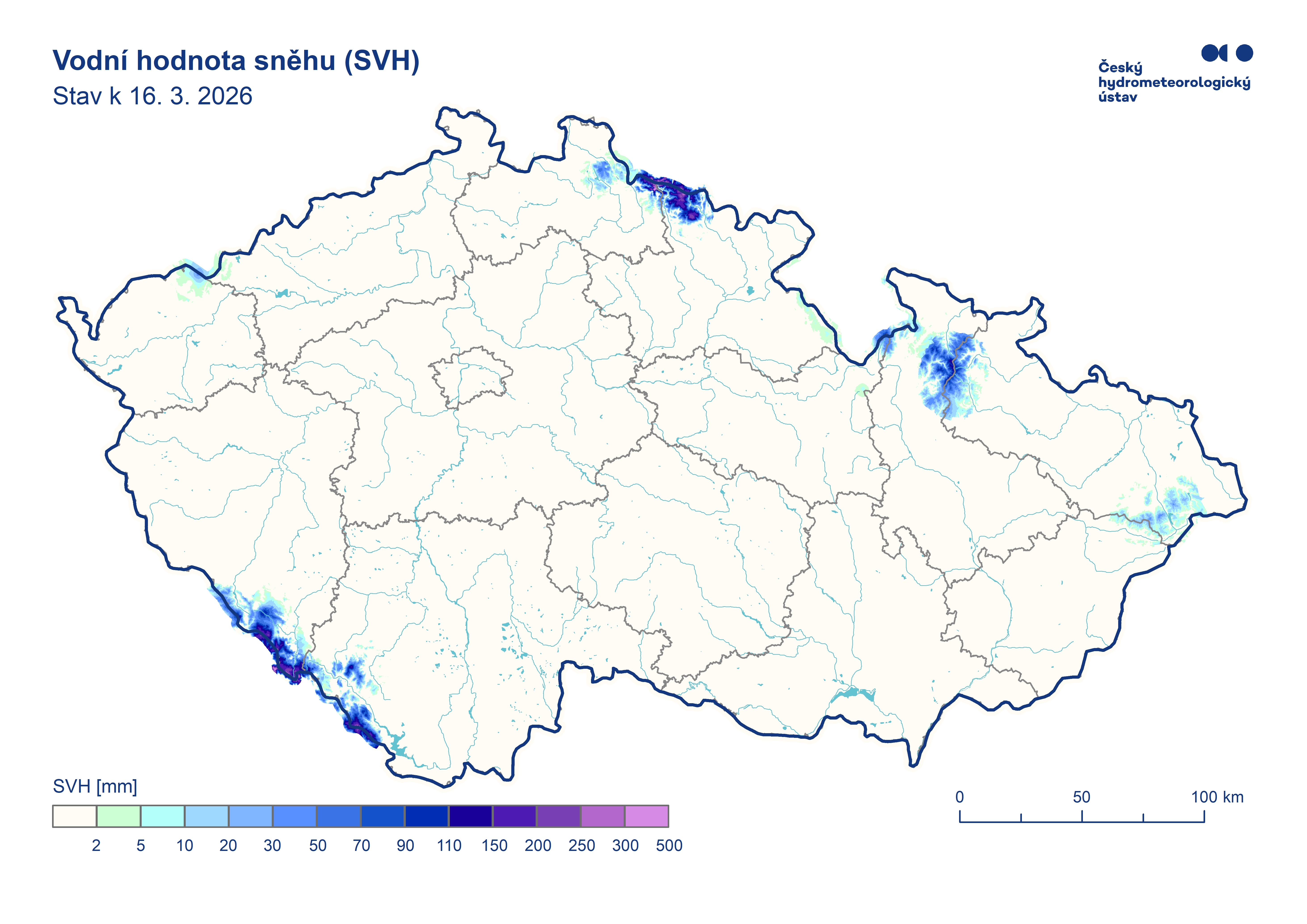 Odhad celkového množství vody ve sněhové pokrývce na území ČR k 19. 3. 2026 činí cca 0,095 mld. m3, což představuje v průměru cca 1,2 mm (1,2 litrů na jeden metr čtvereční). Zásoby vody ve sněhu se pro celkovou plochu ČR ve srovnání s předchozím týdnem snížily. Oproti hodnotám z minulého týdne (11 % průměru pro 10. týden) jsou aktuálně zásoby vody ve sněhu na 7 % dlouhodobého průměru pro jedenáctý týden v roce.