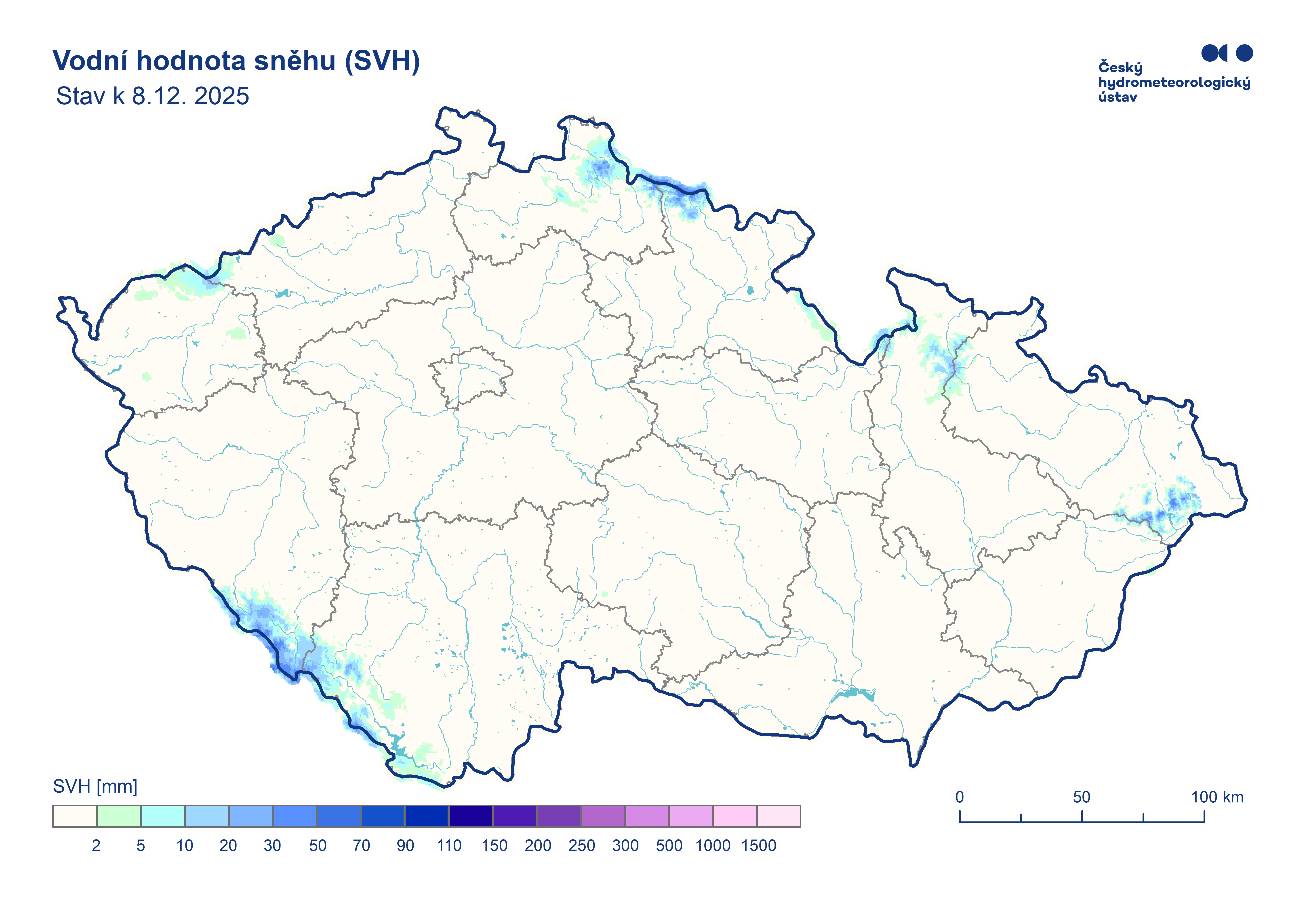 Odhad celkového množství vody ve sněhové pokrývce na území ČR k 8. 12. 2025 činí cca 0,034 mld. m3, což představuje v průměru cca 0,4 mm (0,4 litrů na jeden metr čtvereční).