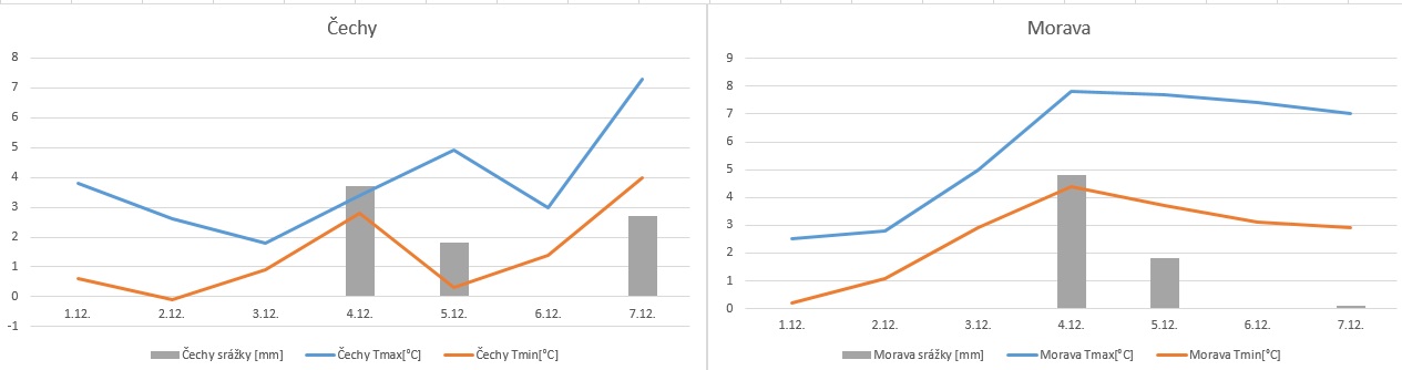 V první polovině týdne od 1. do 8. 12. převažovalo inverzní počasí a jen místy se vyskytly velmi slabé srážky, na hřebenech hor bylo i slunečno. Ve druhé polovině týdne postupně rozrušily inverzi jednotlivé fronty. Nejvíce srážek se vyskytlo v noci ze čtvrtka na pátek a v pátek během dne a od neděle se začalo od jihozápadu výrazně oteplovat.