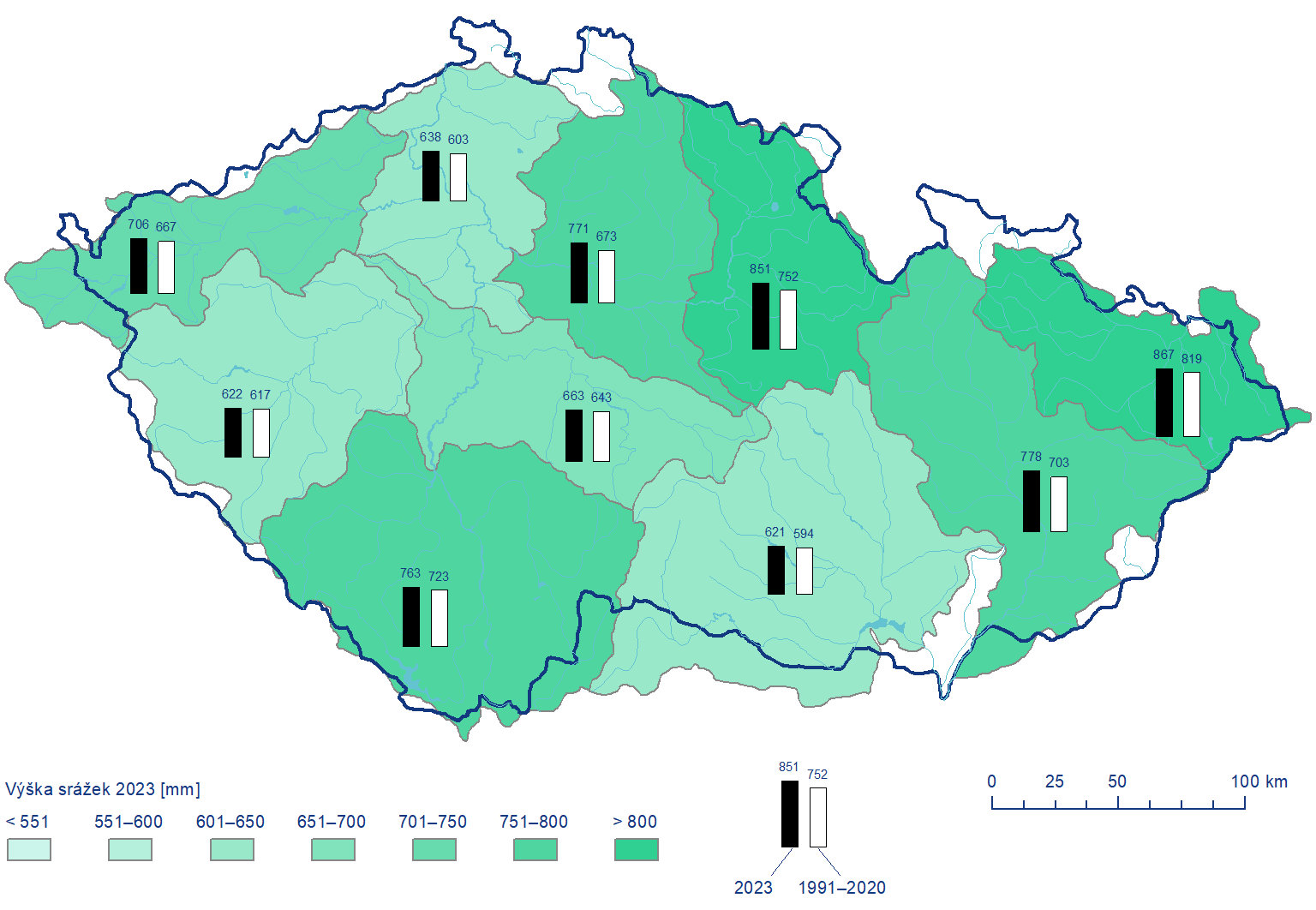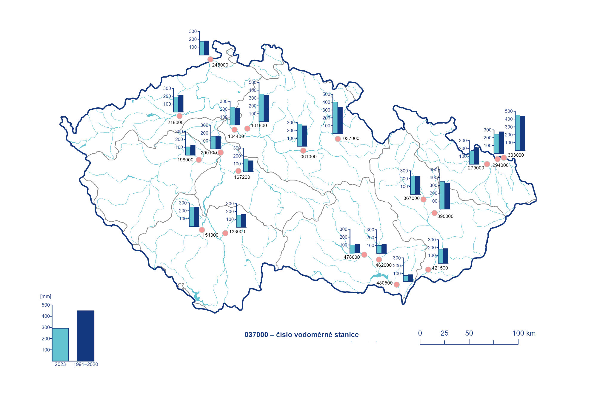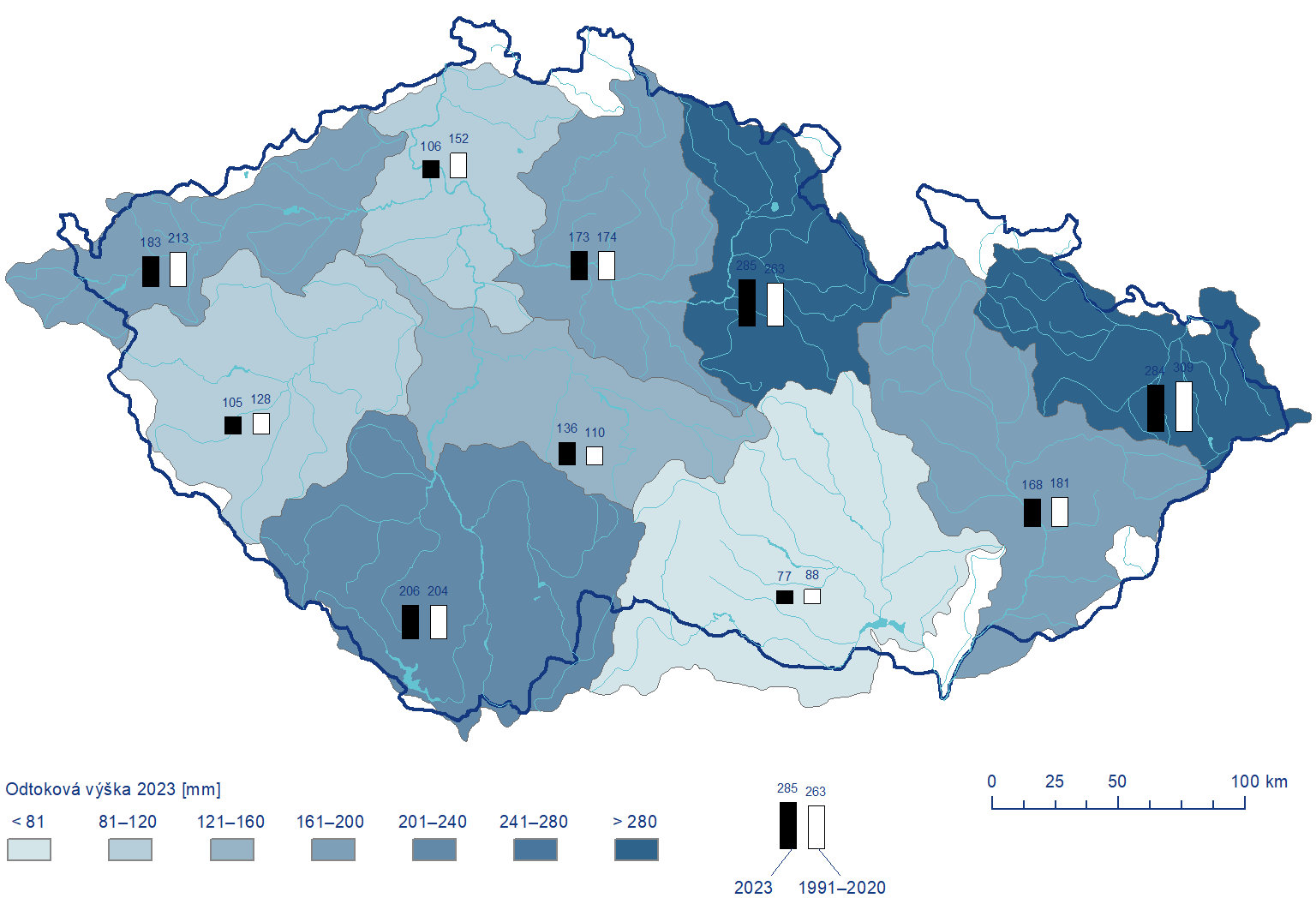 Nejvyšší denní koncentrace plavenin byly zaznamenány v rozmezí 107 mg·l–1 až 2265 mg·l–1, s maximem 2427 mg·l–1 na toku Moštěnka v Prusech v květnu. Na 21 z 30 lokalit s celoročním pozorováním byl překročen limit pro nerozpuštěné látky. Nejvyšší denní odtok plavenin, 37 460 tun, byl zaznamenán na Moravě v Lanžhotu 18. 5. 2023. Celkově odteklo v roce 2023 z povodí ČR 509 000 tun nerozpuštěných látek. V porovnání s rokem 2022 jde o dvojnásobné množství.