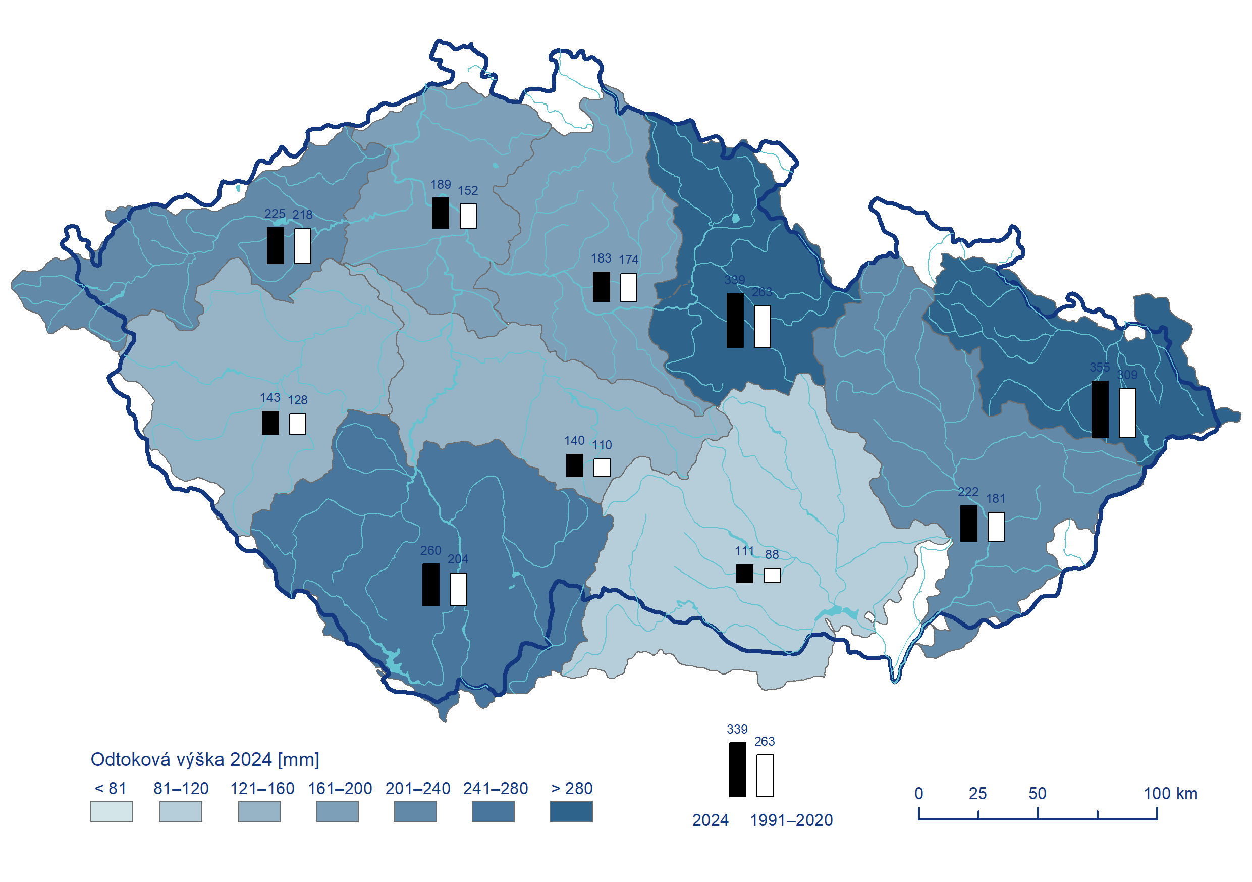 Nejvyšší denní koncentrace plavenin byly zaznamenány v rozmezí 50 mg·l–1 až 3 012 mg·l–1, přičemž zmíněné maximum bylo dosaženo na Moravě v Kroměříži v červenci. Na 21 z 38 lokalit s celoročním pozorováním byl překročen limit pro nerozpuštěné látky. Nejvyšší denní hodnota odtoku plavenin v množství 254 147 tun byla zaznamenána na Odře v Bohumíně během kulminace povodňové vlny 16. 9. Celkově odteklo z povodí ČR 1 044 351 tun nerozpuštěných látek, což byl dvojnásobek v porovnání s rokem 2023 a dokonce více než čtyřnásobek oproti roku 2022. Rok 2024 tak byl díky povodním poměrně extrémní, dlouhodobý roční průměrný odtok plavenin z povodí ČR (od roku 2000) dosahuje 642 050 tun.