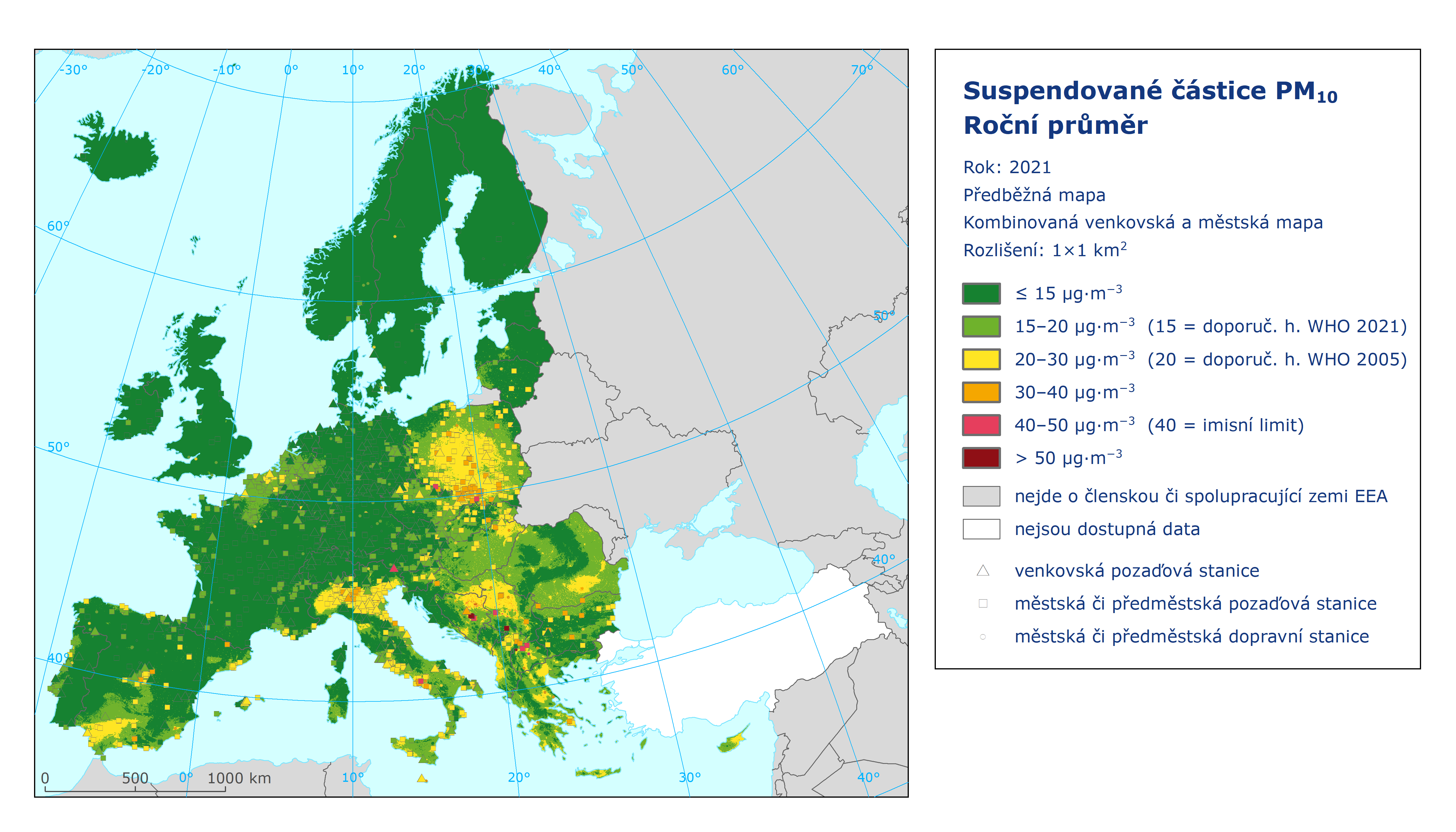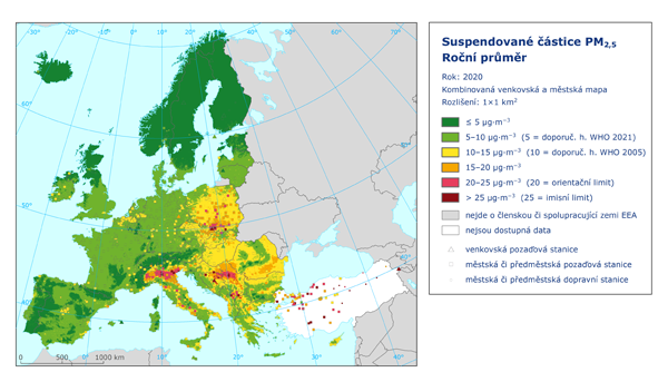 Odhad procenta populace Evropy vystavené v tříletém období 2018–2020 koncentracím vyšším, než jsou doporučené hodnoty WHO 2021 (Tab. I.3), byl ještě vyšší, a to 62–83 % pro roční koncentraci PM10, 97–98 % pro roční koncentraci PM2,5 a 72–83 % pro roční koncentraci NO2 (ETC/HE 2022). Denní koncentraci O3 vyšší, než je doporučená hodnota WHO 2021, bylo v roce 2019 (což je poslední doposud hodnocený rok ve zprávách EEA) vystaveno 99 % městské populace EU; v případě roční koncentrace benzo[a]pyrenu to bylo 75 % a v případě 24hodinové koncentrace SO2 7 % městské populace EU (EEA 2021).