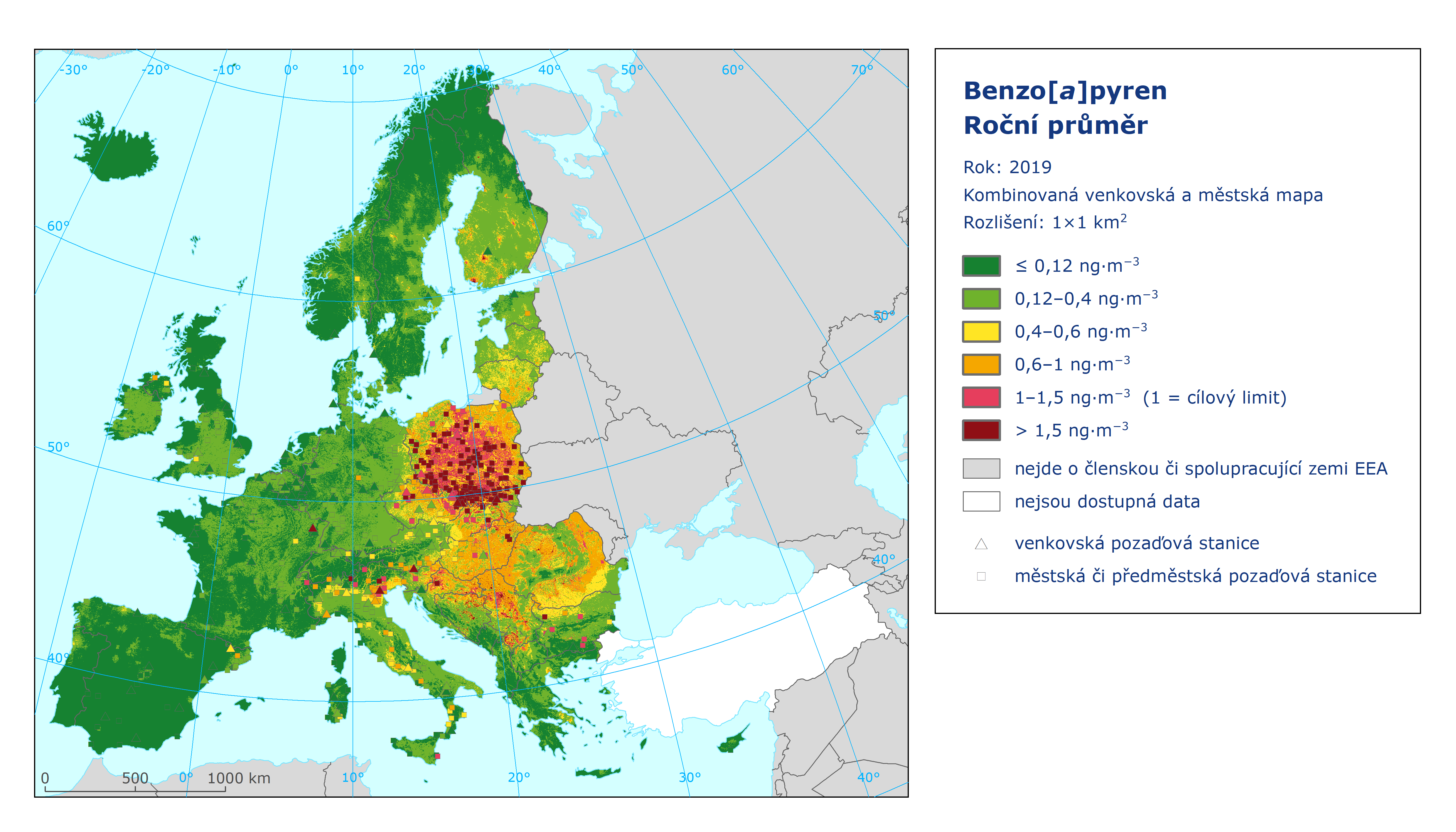 Nadlimitními koncentracemi suspendovaných částic a benzo[a]pyrenu jsou nejvíce zatíženi obyvatelé střední a východní Evropy včetně Balkánského poloostrova, k plošně nejvíce znečištěným oblastem patří rovněž Pádská nížina v severní Itálii (Obr. VIII.3, Obr. VIII.4, Obr. VIII.5).