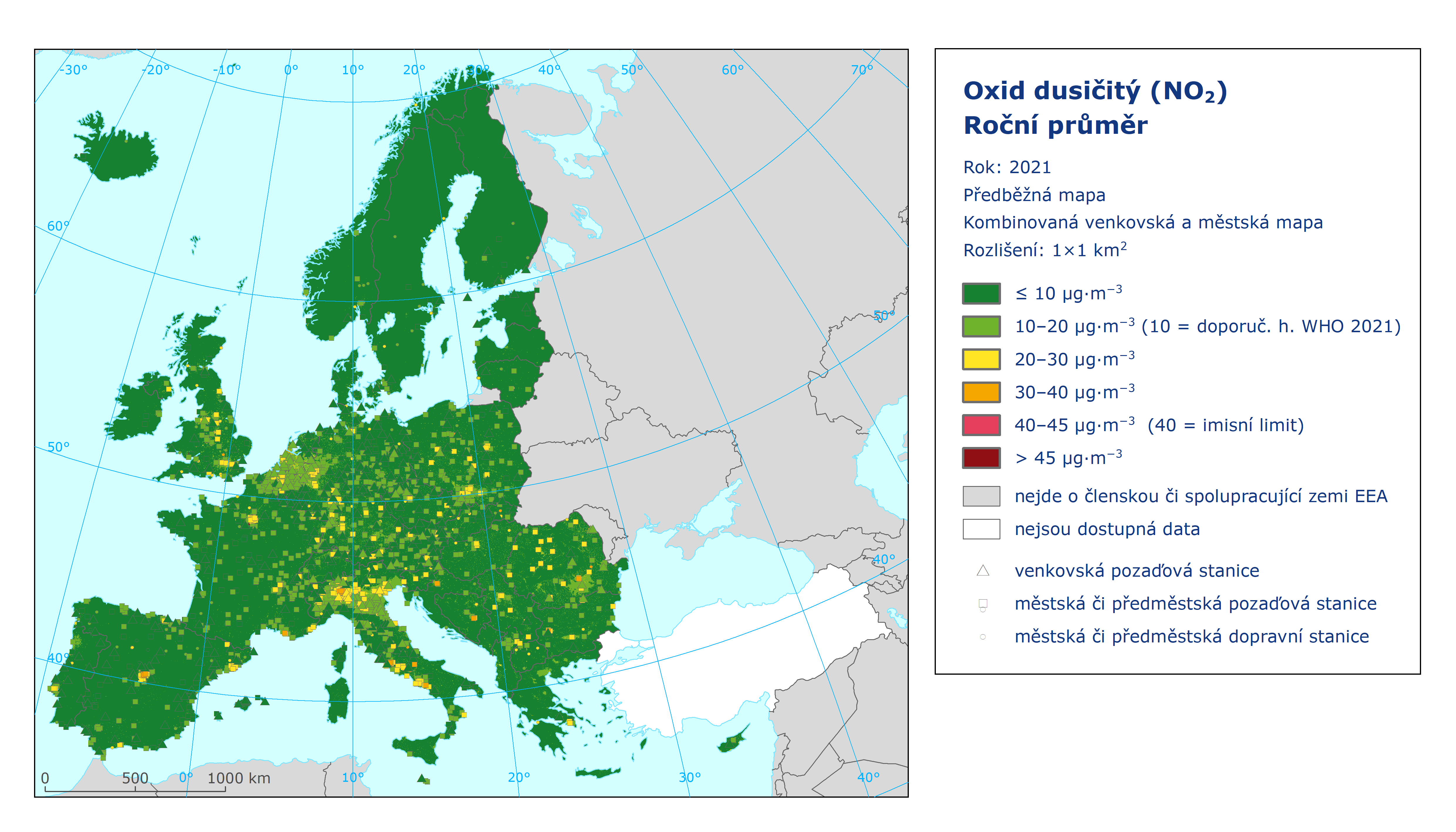 Limitní koncentrace NO2 jsou překračovány zejména v lokalitách ovlivněných dopravou (Obr. VIII.6). Výskyt nadlimitních koncentrací lze předpokládat i ve státech, které výše zmíněné škodliviny sledují pouze na omezeném počtu lokalit, nebo je nesledují vůbec, resp. tyto údaje EEA nepředávají.