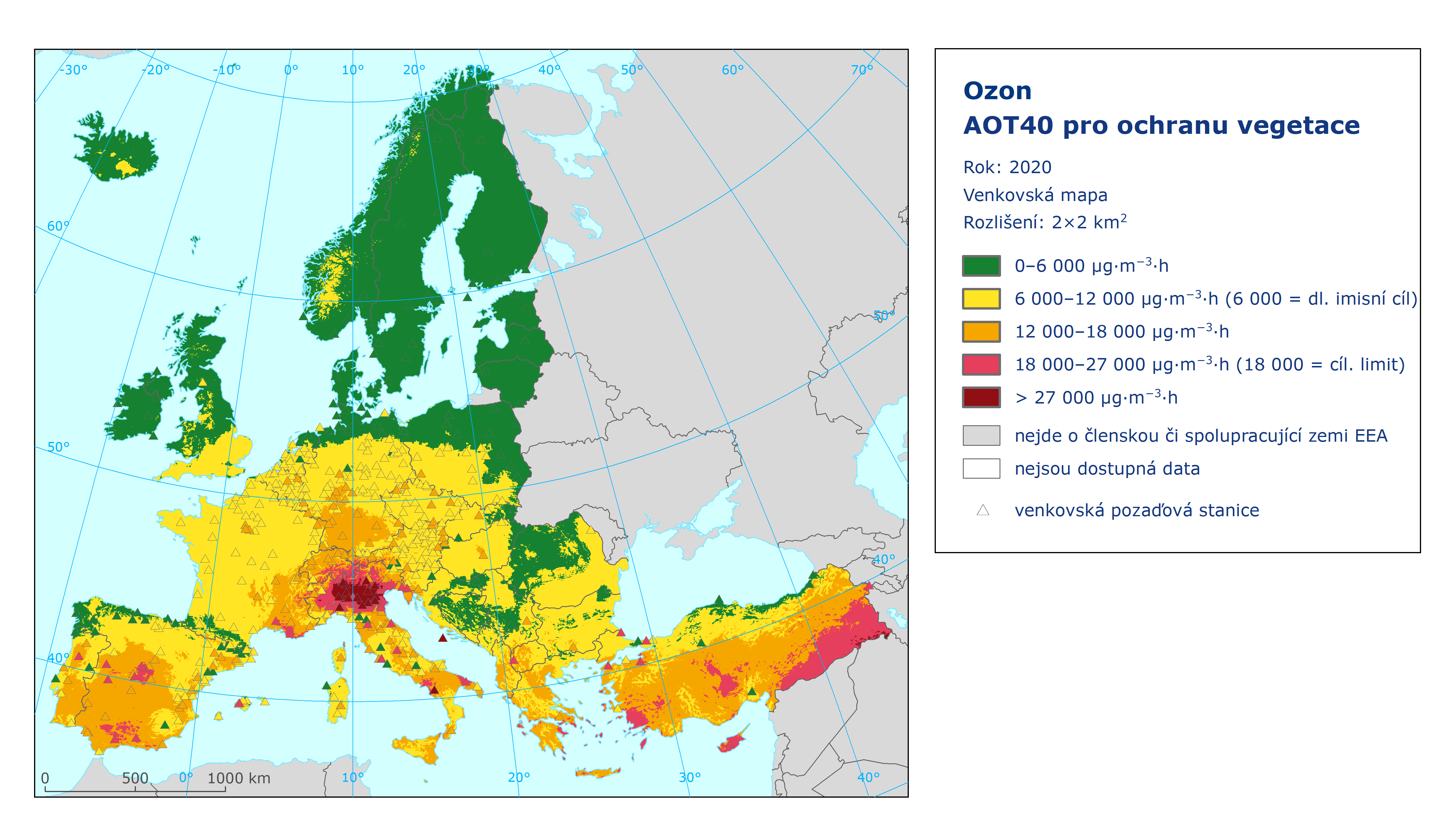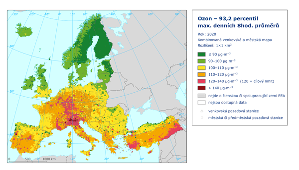 K primárním škodlivinám, které pocházejí z místních a oblastních zdrojů emisí, se přidává znečištění ovzduší sekundárním aerosolem (kap. IV.1.3, IV.9.2) a O3. Koncentrace O3 vzhledem k mechanismu jeho vzniku (kap. IV.4.3) narůstají od nízkých hodnot v severní Evropě až po nejvyšší koncentrace zejména ve státech kolem Středozemního moře (Obr. VIII.7, Obr. VIII.8).