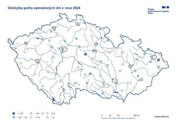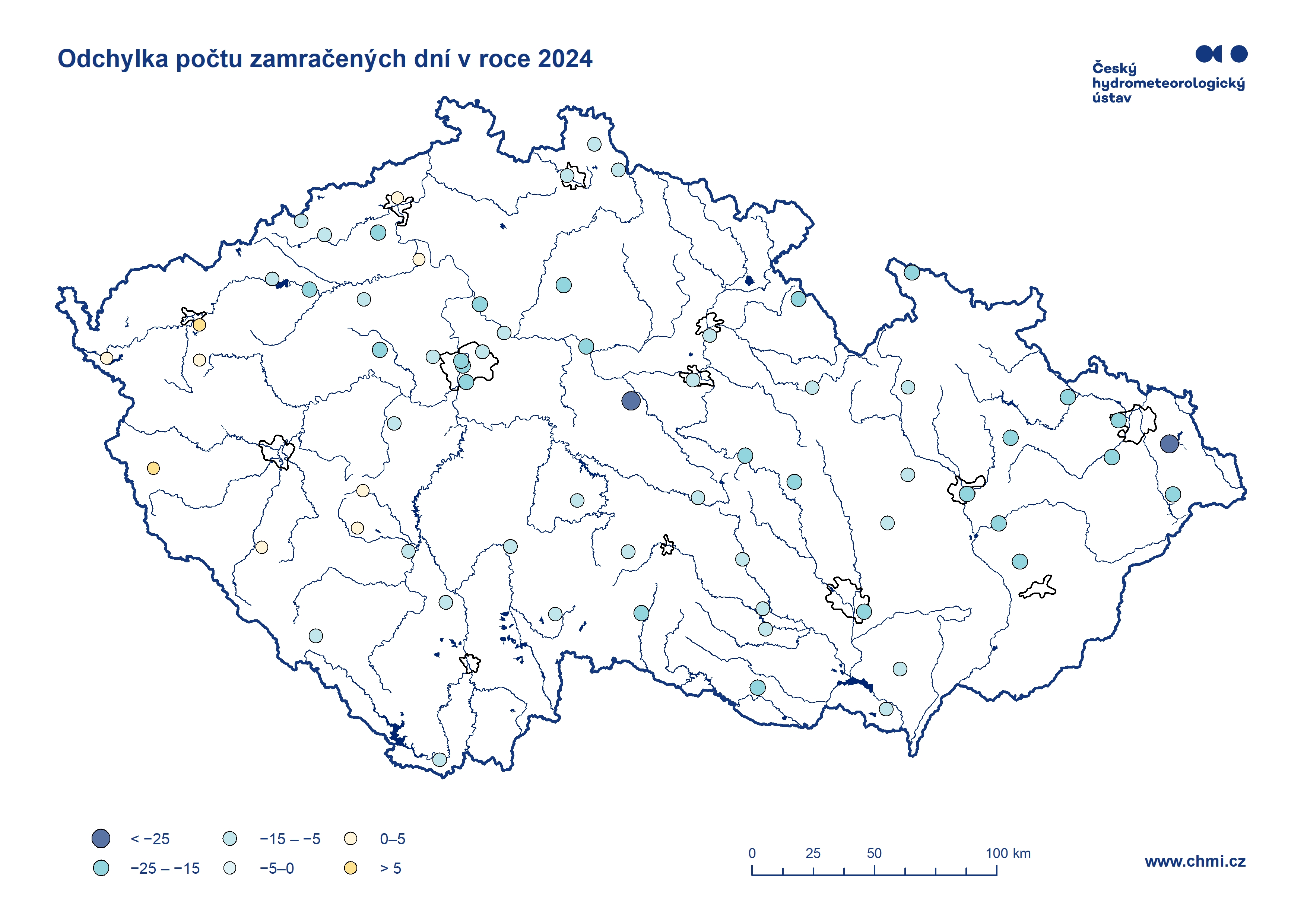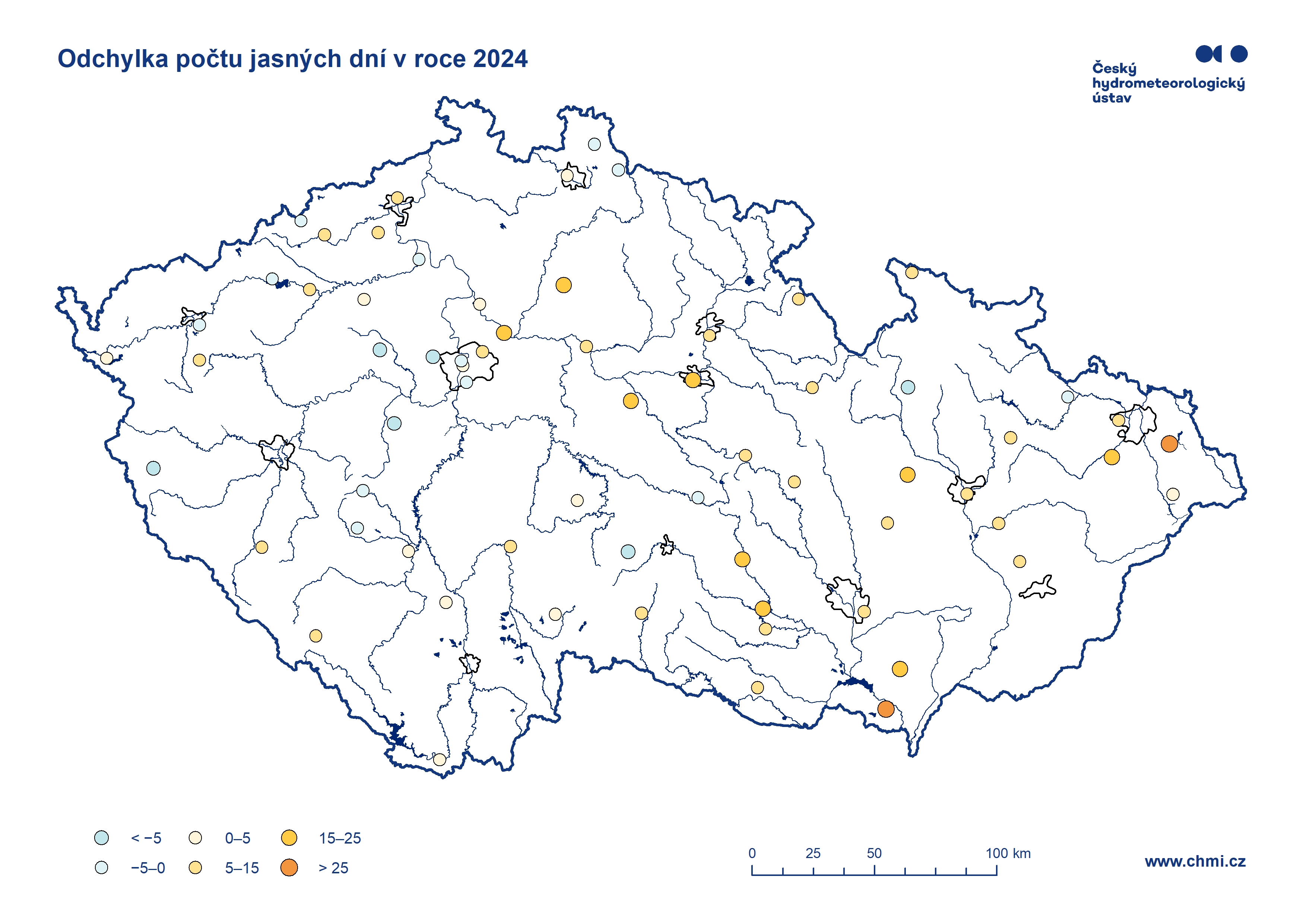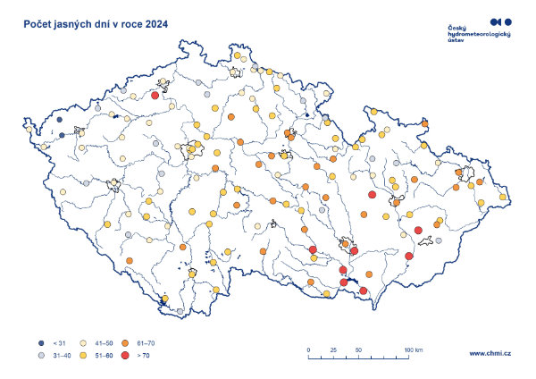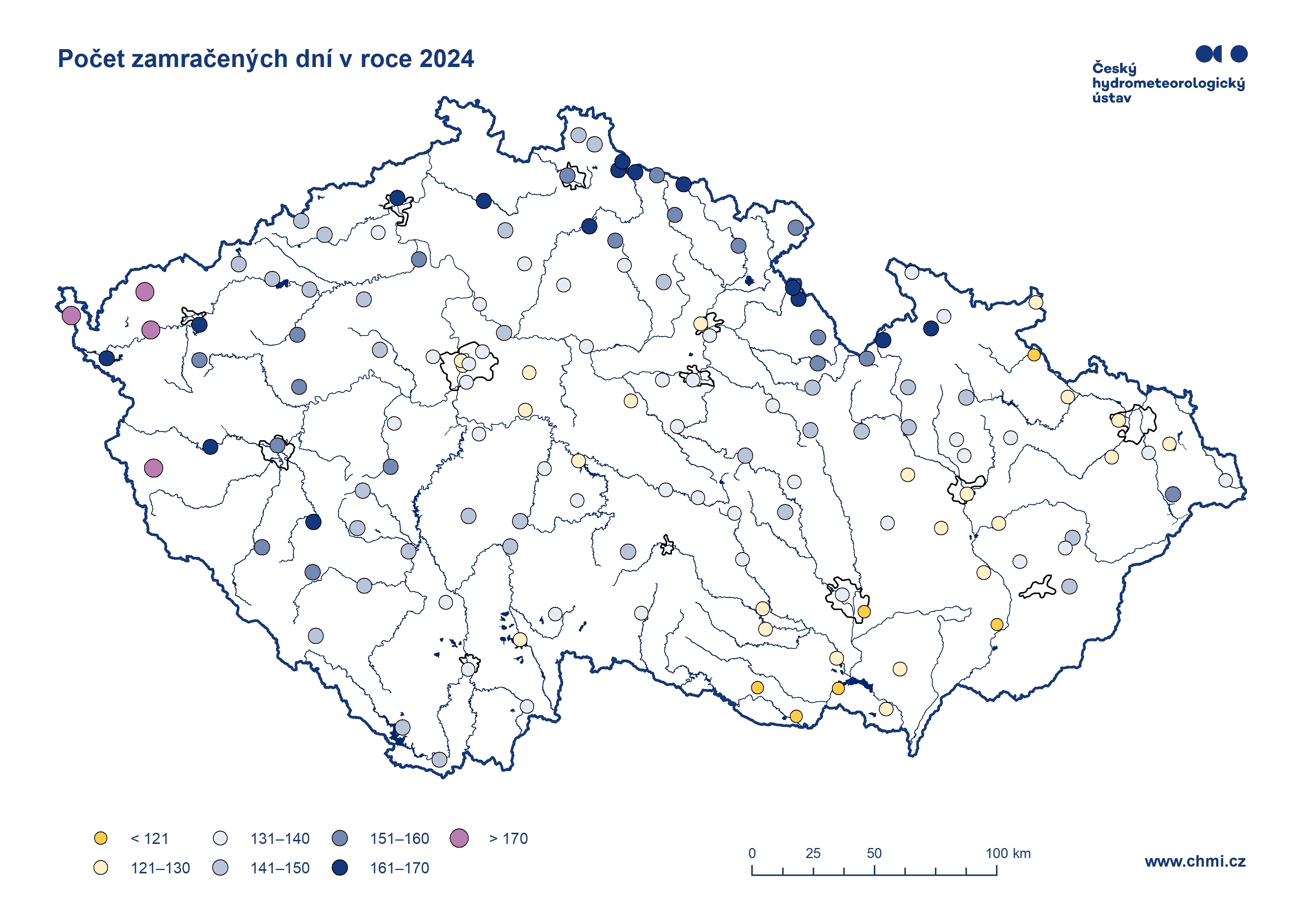 Počet zamračených dní v roce 2024 se na území ČR pohyboval nejčastěji mezi 140 až 150 dny, nejvíce zamračených dní zaznamenaly stanice v západní části Čech (Sokolov 183 dní, Aš 181 dní, Šindelová 176 dní a Přimda 175 dní). Nejméně zamračených dní bylo na Moravě, 113 dní v Krnově, 115 dní v Kuchařovicích a 117 dní v Dyjákovicích.