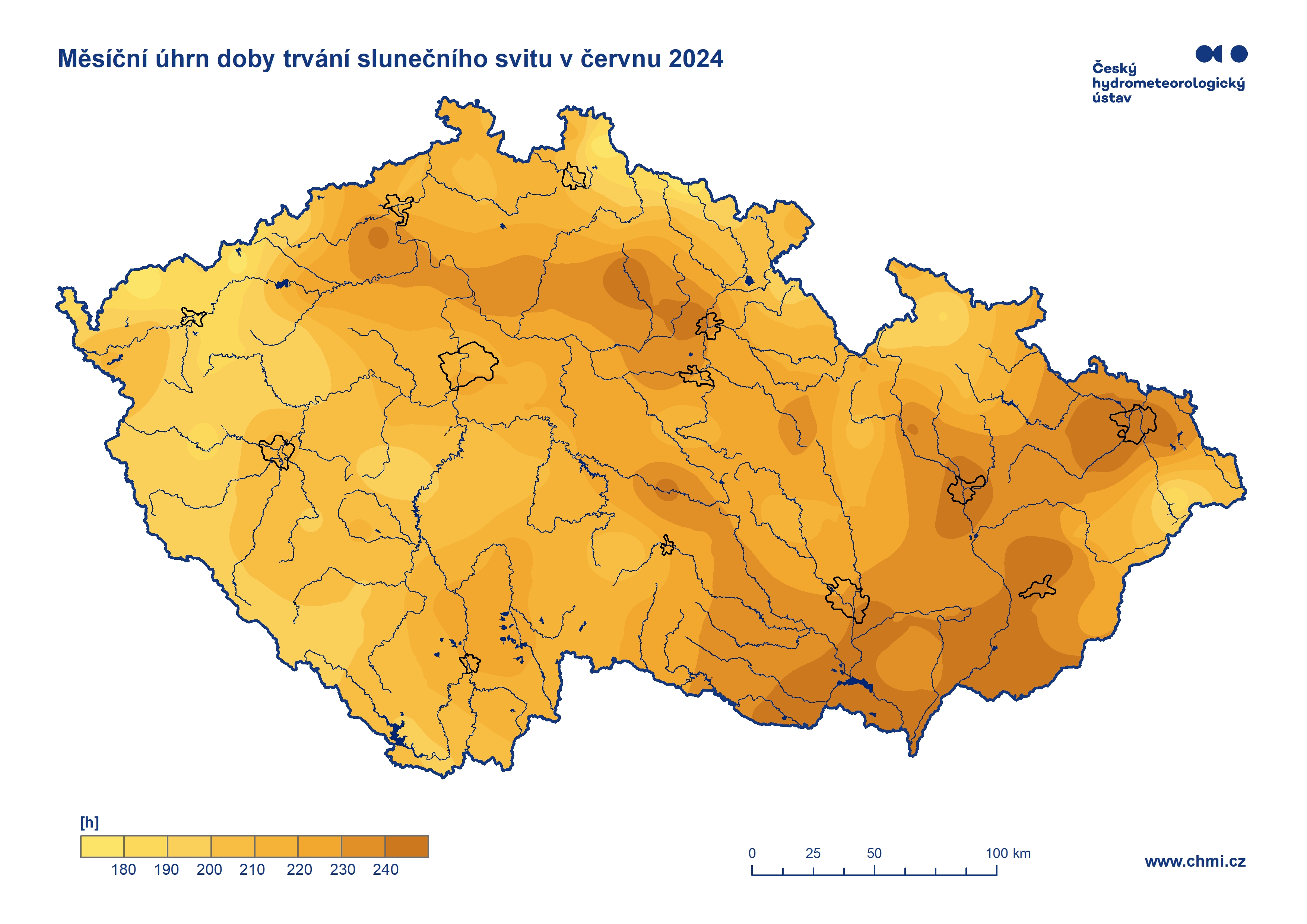 Nejdelší denní suma slunečního svitu v ČR v roce 2024 15,6 h byla zaznamenána na stanici Milešovka v červnu.