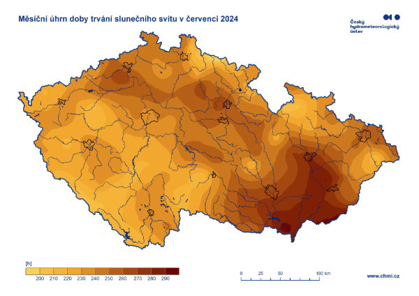 V roce 2024 na žádné stanici nepřekročila měsíční suma doby trvání slunečního svitu hodnotu 300 h, nejvyšší měsíční úhrn byl zaznamenán v červenci na stanici Lednice.