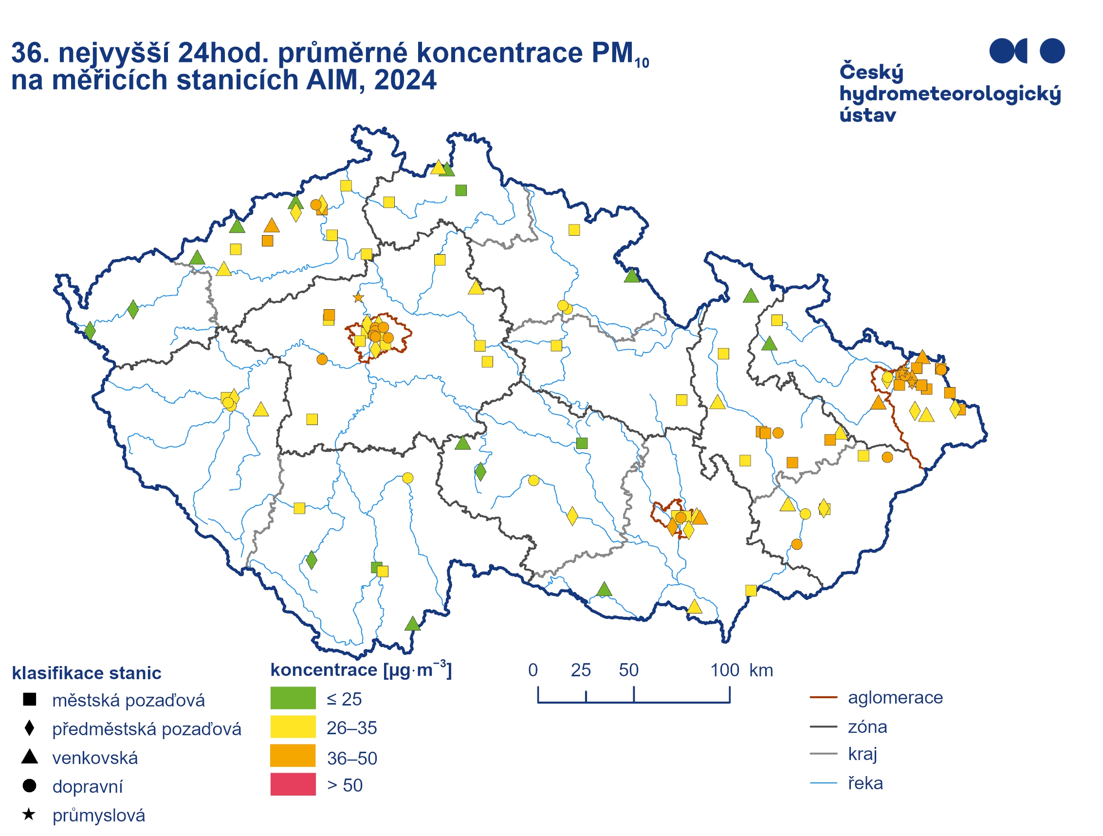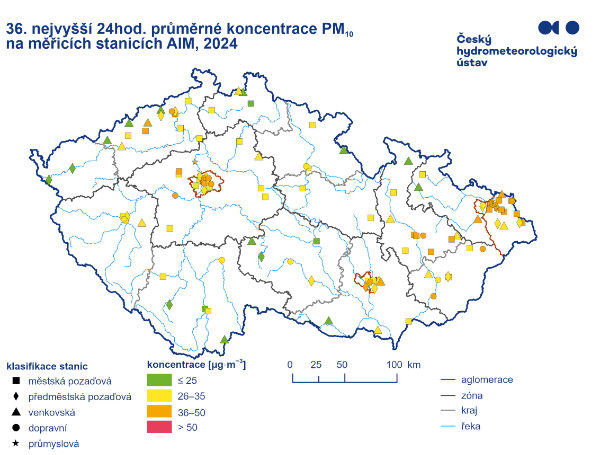 Imisní limit pro průměrnou 24hodinovou koncentraci PM10 nebyl v roce 2024 překročen na žádné stanici s automatizovaným měřením. Stalo se tak podruhé v celé historii měření PM10 od 90. let 20. století. Poprvé nebyl tento limit překročen v roce 2023 (Obr. 5).