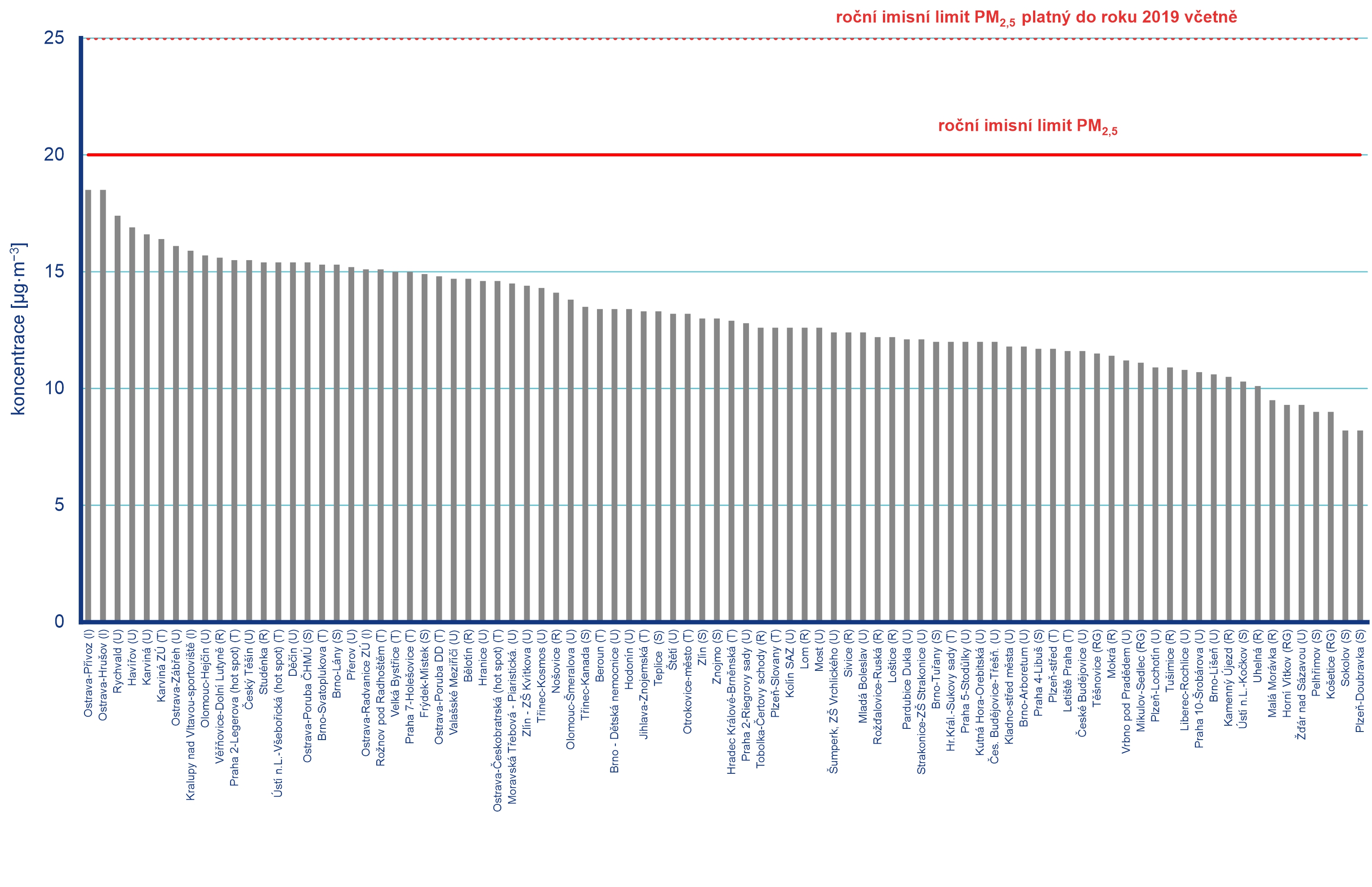 Imisní limit pro roční průměrnou koncentraci PM2,5 nebyl v roce 2024 překročen na žádné stanici s automatizovaným měřicím programem. Stalo se tak podruhé od zavedení tohoto limitu v roce 2005, který byl navíc v roce 2020 zpřísněn. Poprvé nebyl tento limit překročen v roce 2023 (Obr. 6).