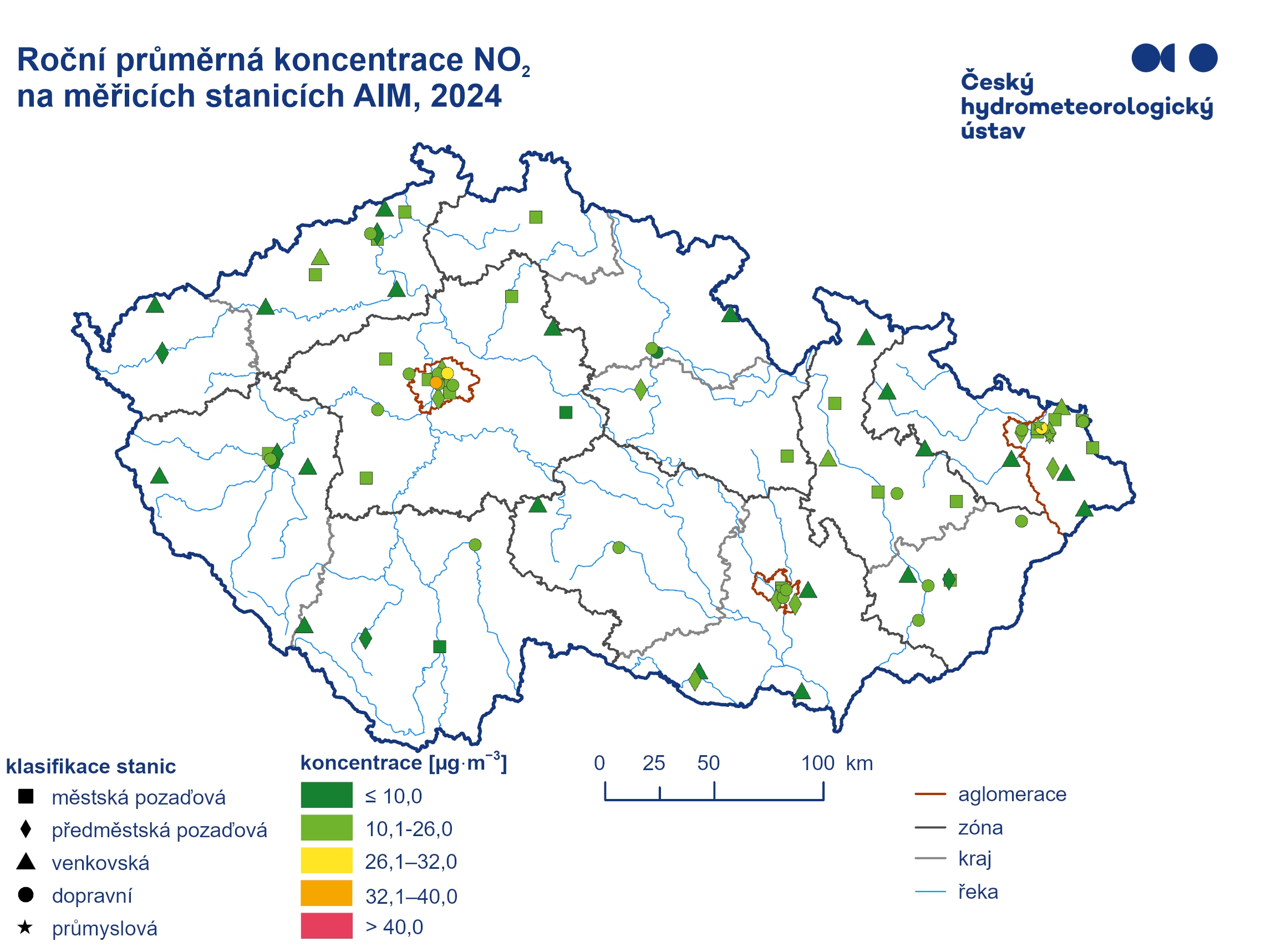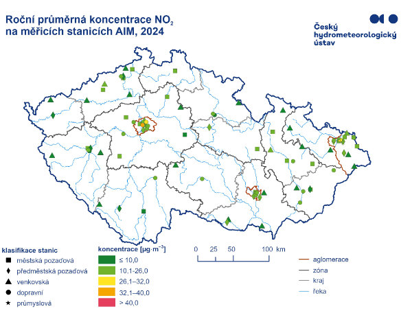 Rok 2024 byl z hlediska kvality ovzduší vyhovující. Prodloužil tak období od roku 2020, kdy lze konstatovat, že koncentrace látek znečišťujících ovzduší byly výrazně nižší než v předchozím období. U některých látek (suspendované částice PM10 a PM2,5 a oxid uhelnatý (CO)) se však oproti historickým minimům v roce 2023 koncentrace mírně zvýšily a v roce 2024 dosáhly druhých nejnižších hodnot. Koncentrace oxidu dusičitého (NO2) opět nepatrně klesly a dosáhly v roce 2024 nejnižších hodnot jak za hodnocené období 2014–2024, tak za celou historii měření. U koncentrací oxidu siřičitého (SO2) došlo v roce 2024 k navýšení celorepublikového průměru koncentrací, což bylo způsobeno vyššími koncentracemi v Ústeckém kraji; koncentrace SO2 v roce 2024 byly páté nejnižší za hodnocené období 2014–2024. Koncentrace přízemního ozonu (O3) v roce 2024 byly v rámci jedenáctiletého období 2014–2024 páté nejnižší (Obr. 1).