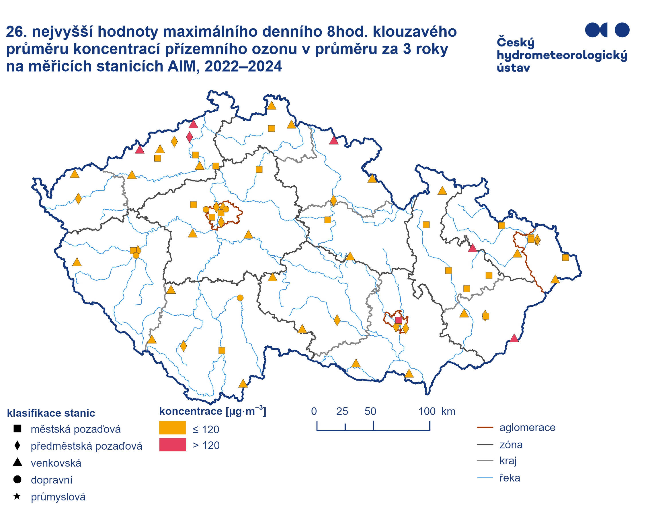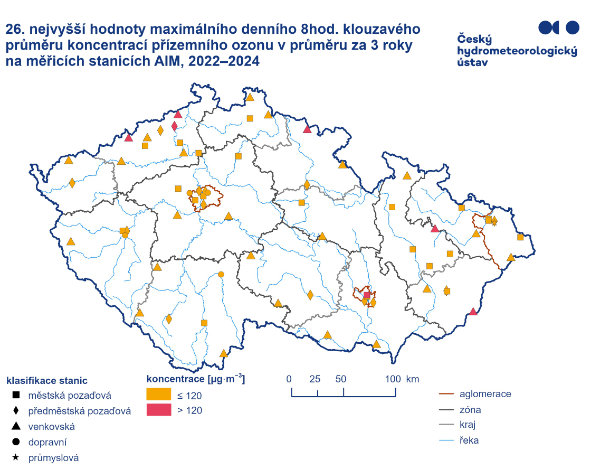Imisní limit O3 byl v roce 2024 (hodnoceno za tříleté období 2022–2024) překročen na 10 % stanic (7 z 68 stanic) (Obr. 8).